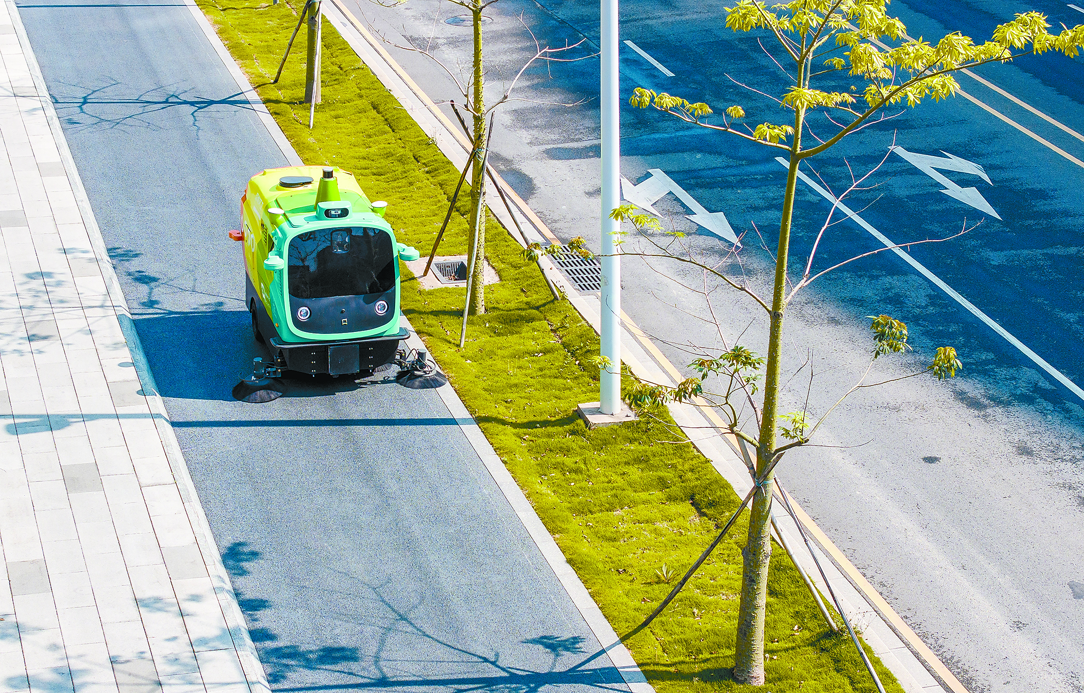 3月19日,在深圳市坪山区坑梓街道,环卫机器人在清扫街道(无人机照片)。