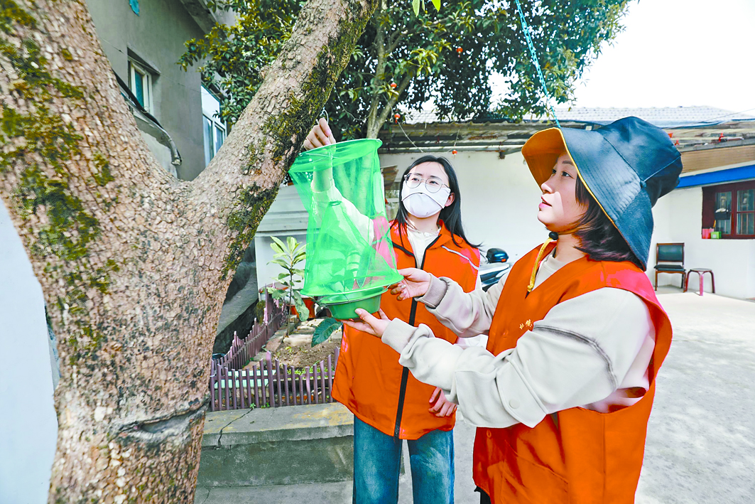 日前,向山镇杜塘村志愿者在农家小院树枝上悬挂无毒苍蝇诱笼,拉开“爱国卫生月”病媒生物防制行动序幕。
