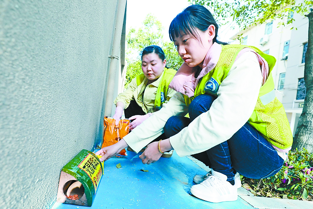 4月15日,平湖街道湖西社区网格员正在小区投放灭鼠药。
