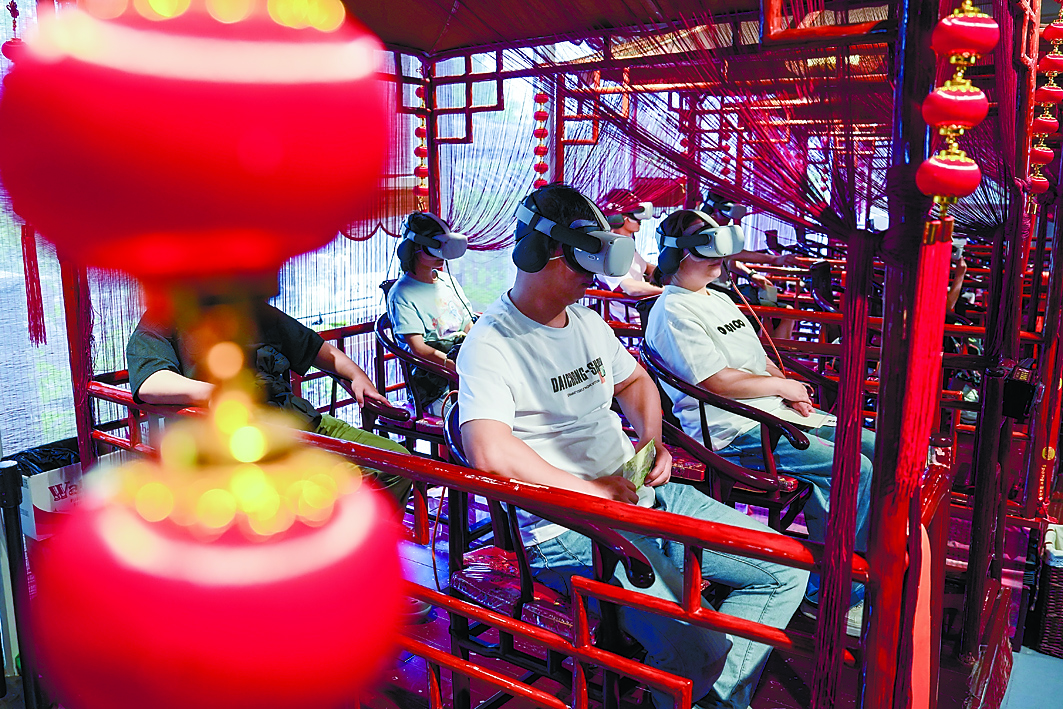 游客在苏州拙政园体验VR漫游(5月18日摄)。
