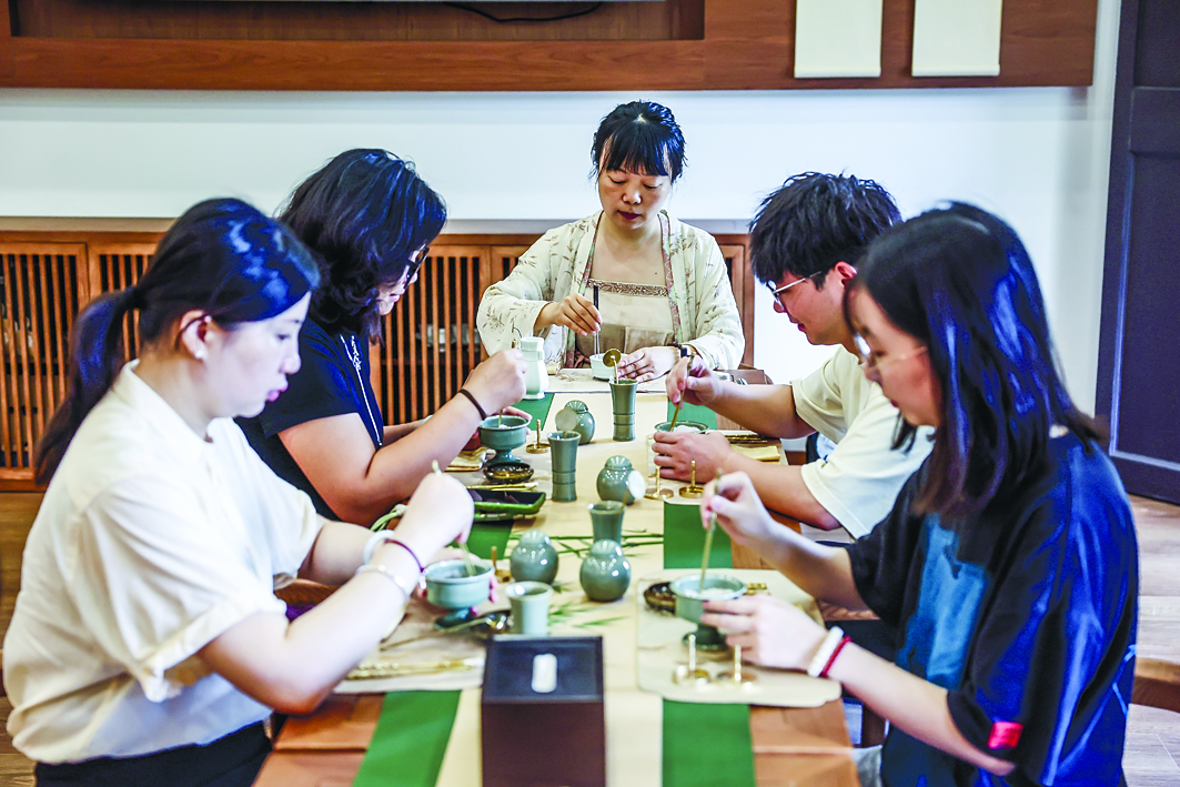 6月10日,游客在子城欢喜书店“江湖书局”民艺巷沉浸式体验传统篆香技艺。