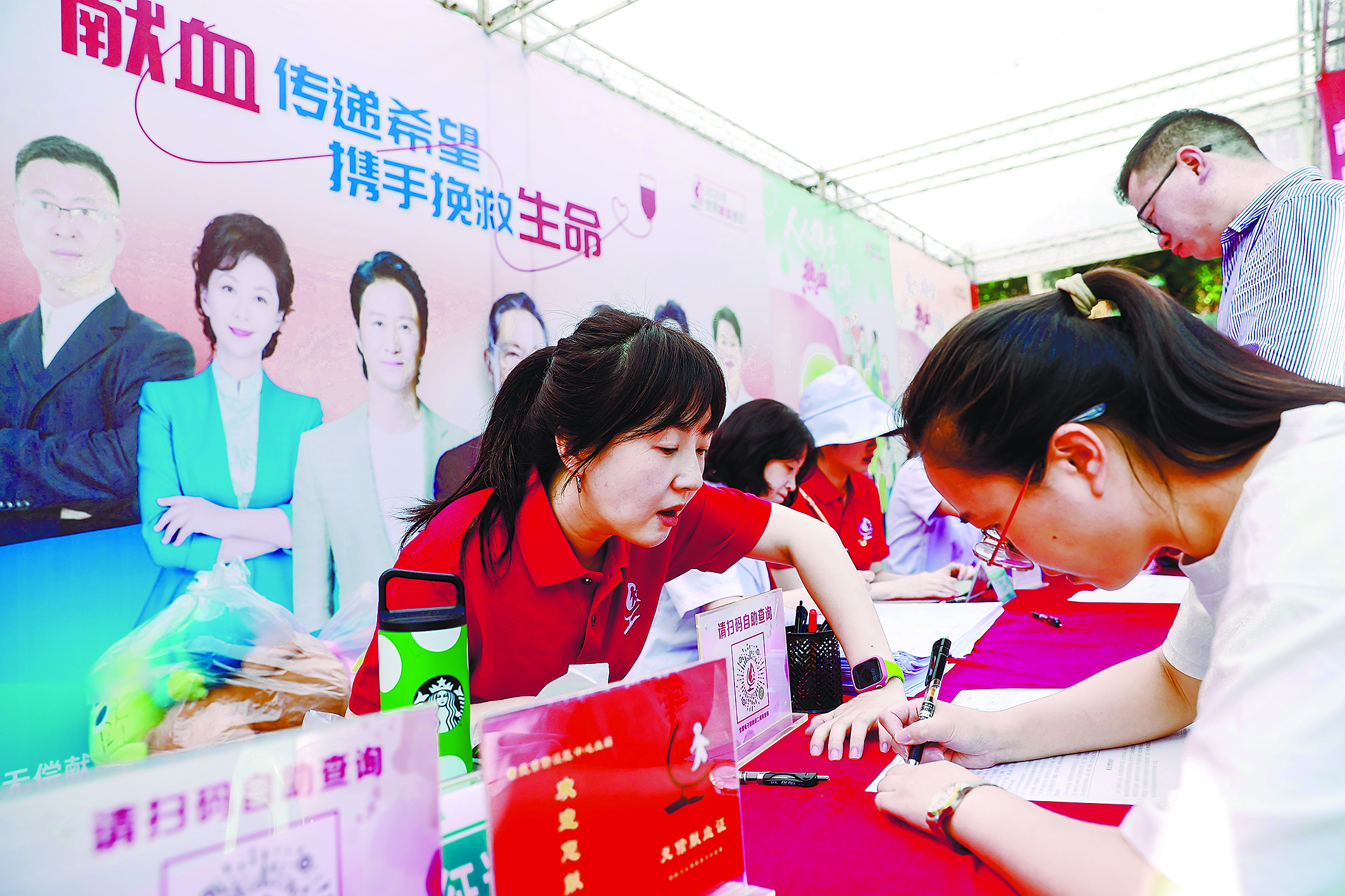 6月14日,志愿者(左)在重庆市黔江区献血爱心屋指导无偿献血市民填写资料。当日是第22个世界献血者日,我国的活动口号为“献血传递希望 携手挽救生命”。 新华社发(杨敏 摄)