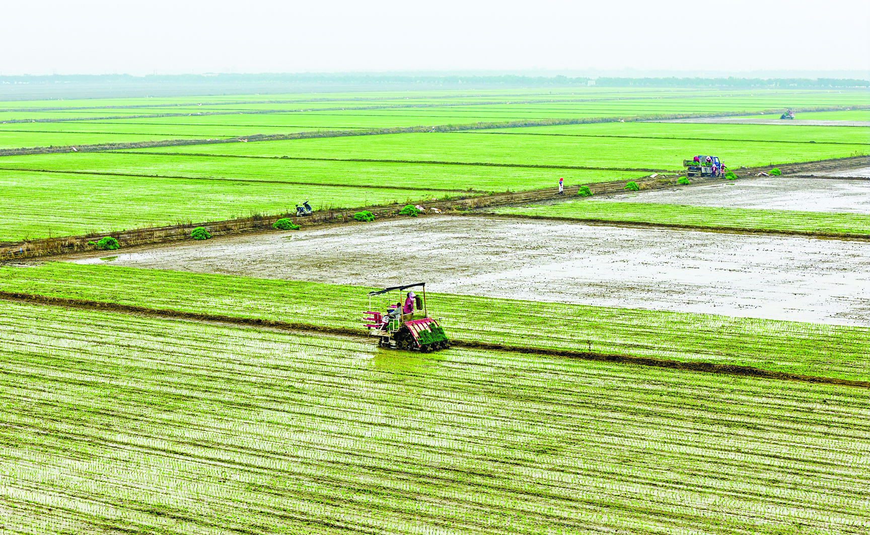 6月11日,当涂县塘南镇盛农农场的高标准农田宛如一幅生机勃勃的动态画卷。农机手熟练地驾驶着插秧机在田垄间往返作业,一株株嫩绿的秧苗勾勒出整齐的翡翠网格,田间地头一片繁忙,奏响了“三夏”时节农业生产的激昂乐章。