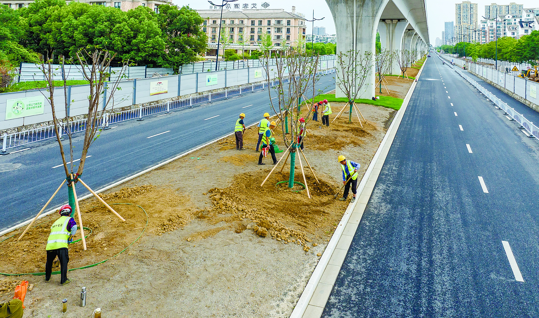 6月20日,江东大道道路恢复工程现场,绿化工人们正在宁马城际铁路高架下栽种树木、铺设草坪。