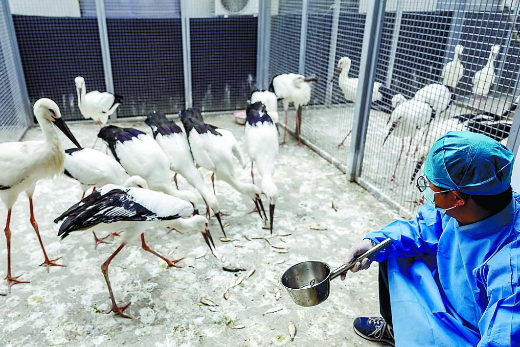 近日,在江苏盐城湿地珍禽国家级自然保护区,王震给收容救护的东方白鹳喂食。29岁的王震是保护区管理处的助理工程师,主要负责陆生野生动物疫源疫病监测,丹顶鹤、东方白鹳等野生动物救助以及丹顶鹤人工种群繁殖与驯化等工作。