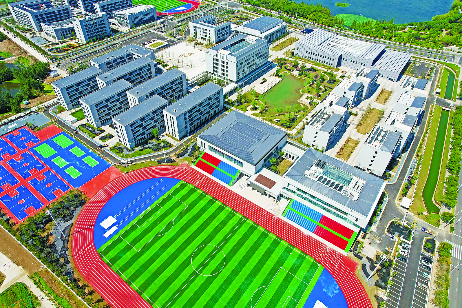 据悉,该新校区总投资8.78亿元,建筑面积近10万平方米,可容纳3700余名学生就读。走进校园,教学楼、科技楼、图书馆等核心建筑功能布局科学,外观兼具现代简约风格与人文设计感;高标准建设的室内体育馆、标准游泳馆、专业射击馆,充分满足高中阶段学生体育训练、竞赛活动及多元化发展需求;学生宿舍、食堂及地下停车场等生活配套设施舒适、便捷,已完成全方位调试。
