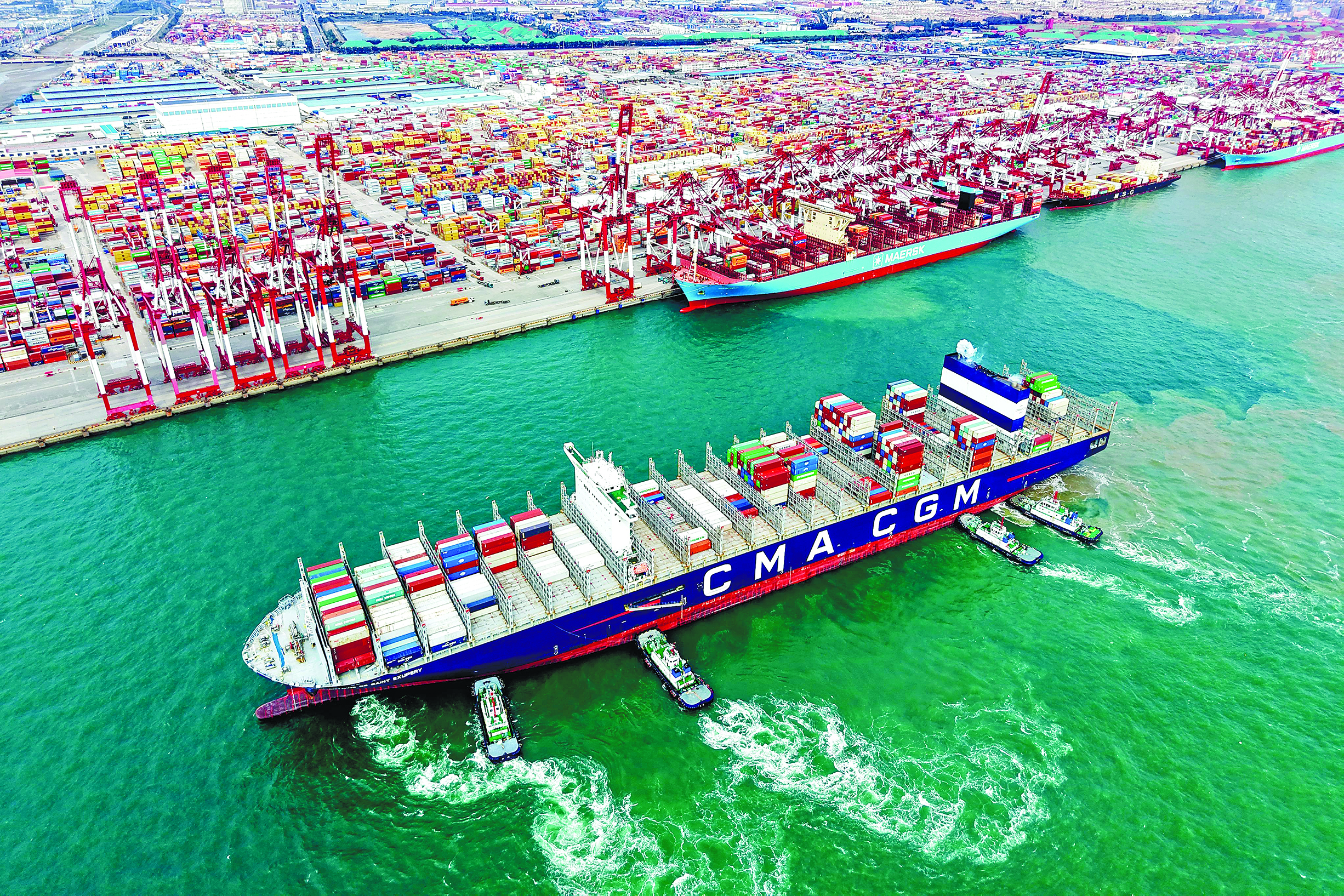 10月20日,在山东港口青岛港,一艘货轮在拖船辅助下停靠集装箱码头(无人机照片)。