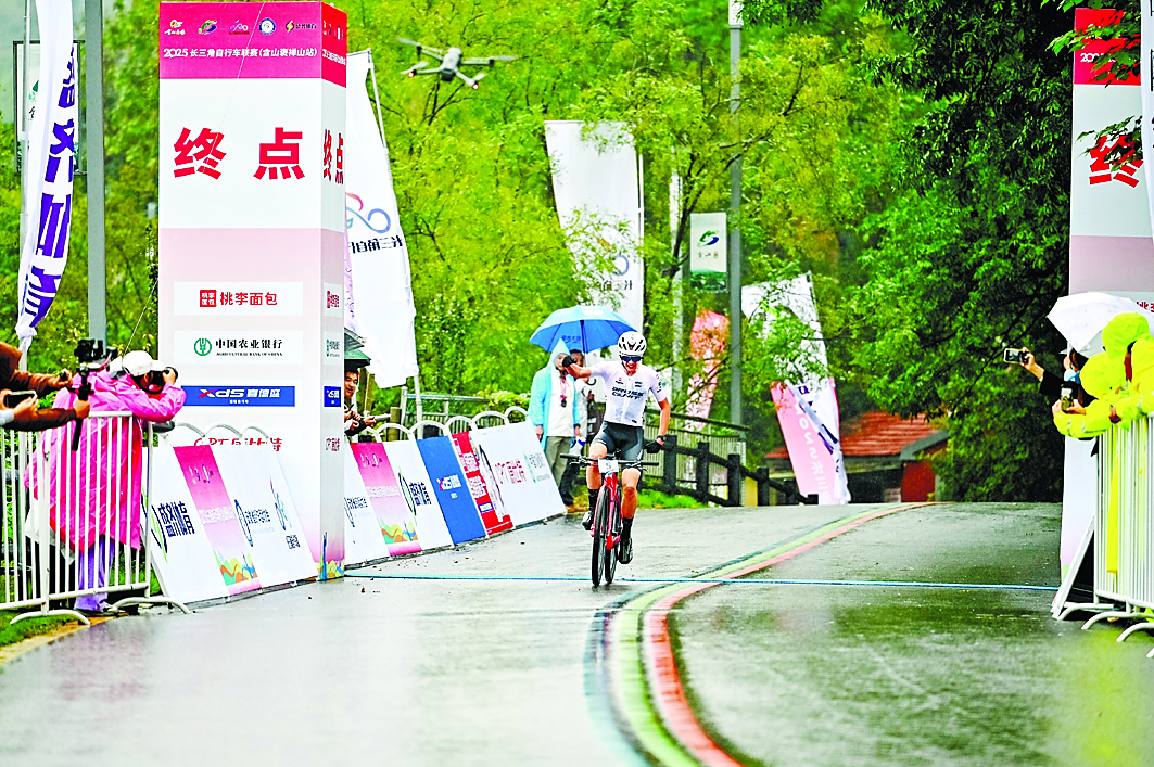 秋雨洗尘,青山跃动。10月19日上午,2025长三角自行车联赛(含山褒禅山站)在安徽省含山县褒禅山景区鸣枪开赛。300余名来自沪苏浙皖的骑行健儿冒雨驰骋,在这条串联起千年历史与生态美景的赛道上,上演了一场速度与耐力的对决。赛道全程30公里,途经华阳洞、伍子胥古道、鳌鱼岭等核心景点,选手们在秋雨绵绵中掠过“古树古井古村落、古寺古街古关隘”的田园画卷,最终在褒禅山景区游客服务中心冲刺完赛。俄罗斯骑友帕维尔以风驰电掣之姿夺得男子山地组冠军,领奖台上,他竖起了大拇指,用略带生涩的中文感慨:“含山好赞!”
