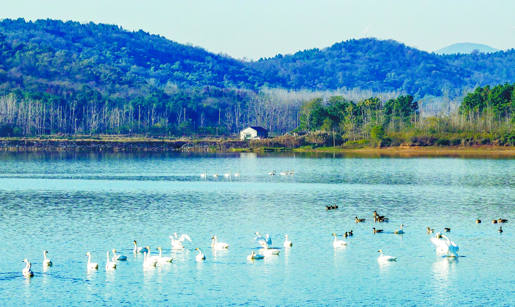 近年来,含山县聚焦河湖治理、森林提质、湿地绿化,通过系统治理优化生态基底,推动昭关湖水质改善、生物多样性提升。如今,越冬天鹅数量逐年递增,这片天然栖息地已成为市民游客青睐的景观带,尽显人与自然和谐共生之美。