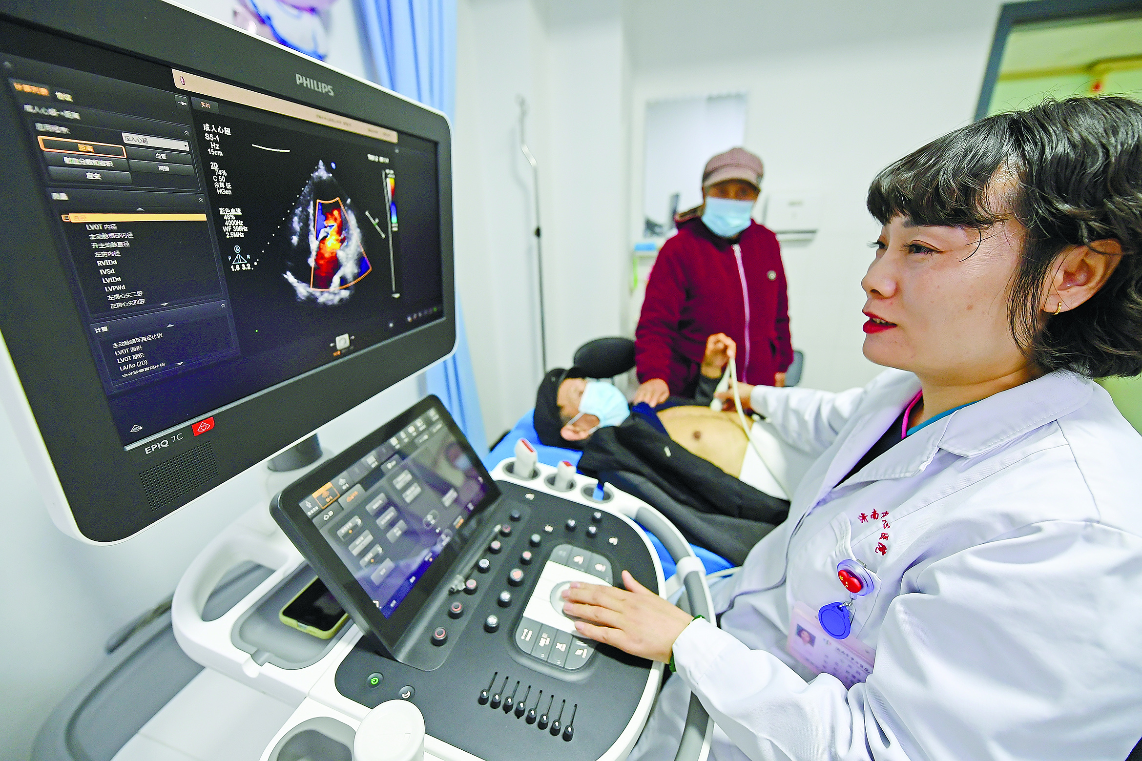 12月7日,济南市中心医院医务人员为人工心脏植入手术康复者复诊。