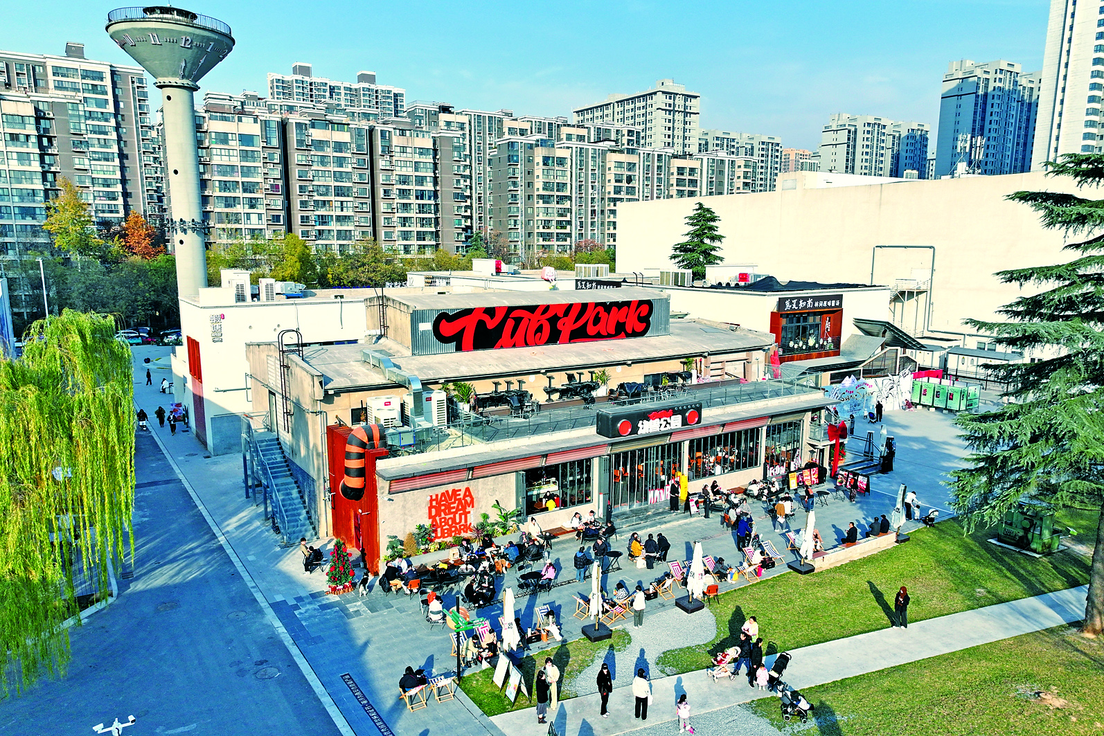 近日,游人在西安时光文化公园消费休闲(无人机照片)。这座公园是由西安国营第一钟表机械厂旧厂区改建而来的。