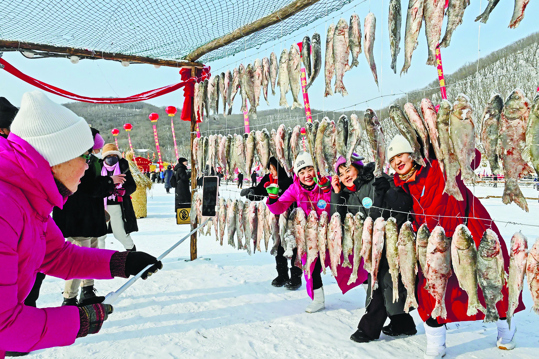 1月15日,游客在冬捕节现场拍照。1月15日,黑龙江省牡丹江市在镜泊湖举行冬捕节,吸引了众多游客前来观赏。镜泊湖是我国最大的高山堰塞湖,这里生态环境优越、渔业资源丰富,孕育了源远流长的渔猎文化。镜泊湖冬捕节已持续开展多年。新华社发(李学斌 摄)