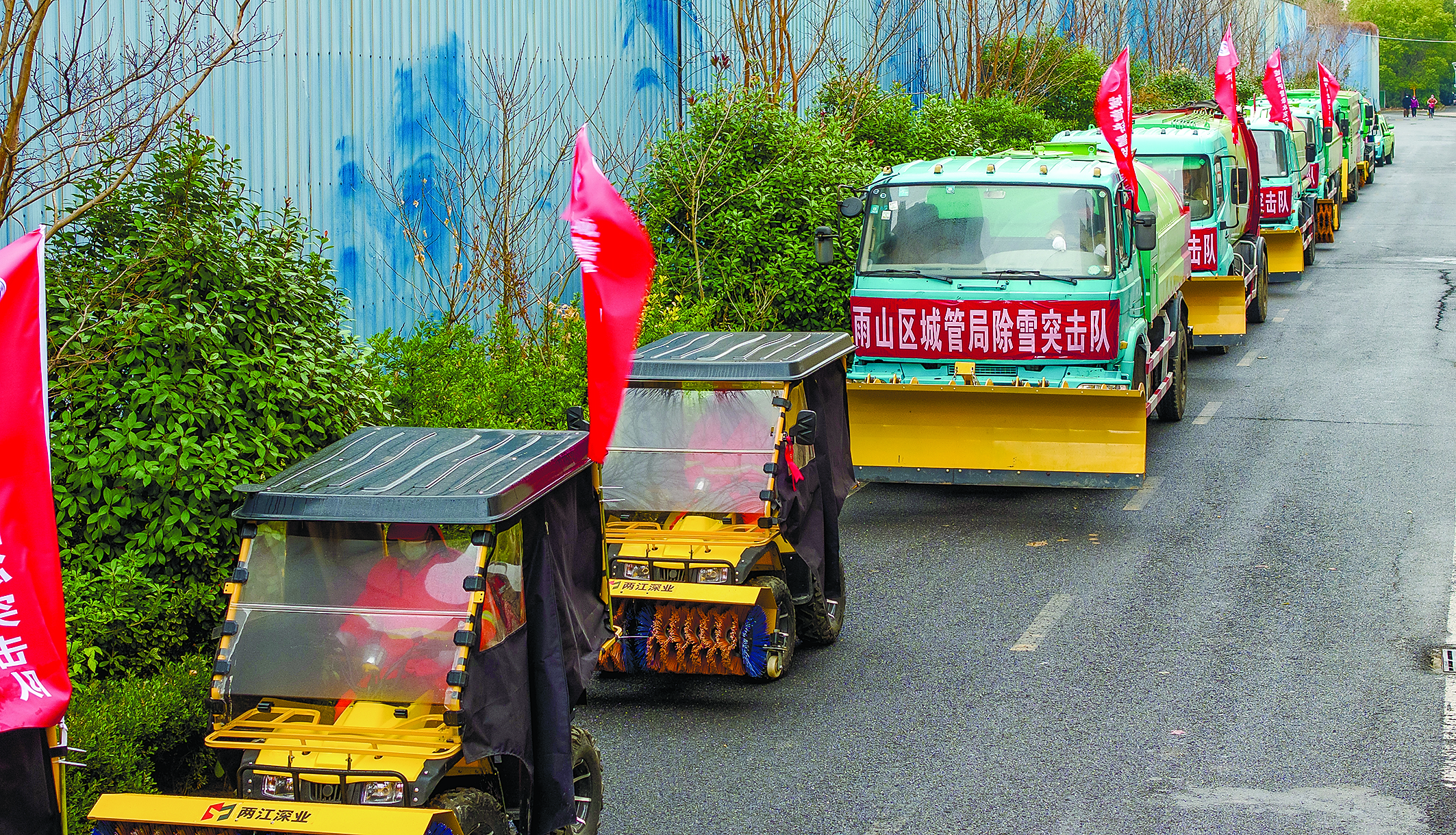 在隐患排查方面,市城管部门按照包保责任制,对全市各类户外广告、楼顶广告开展全面排查,采取除险加固、设置警示标志等措施,严防次生灾害。各县区城管部门同步推进店招标牌、沿街景观的安全检查,及时消除安全隐患。市环卫处组织专职安全员、管理人员和作业人员对环卫车辆进行全方位检修,确保随时投入应急作业。市园林处针对绿化养管作业特点,安排养管单位清理枯死大型乔木,检查游园道路及设施,并对主要道路两侧的香樟等常绿树木进行加固和修剪,防止积雪造成倒伏断枝。