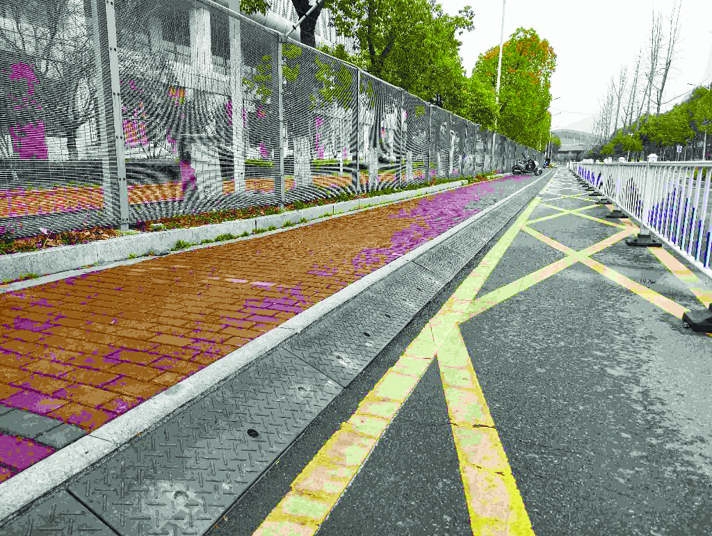 1月27日上午,记者回访现场时看到,目前该处的斜坡垫已经更换完成。记者再次骑上共享单车体验时发现,目前车辆从该处上坡下坡都已经比较“丝滑”。图为更换后的斜坡垫与路牙石已平行。
