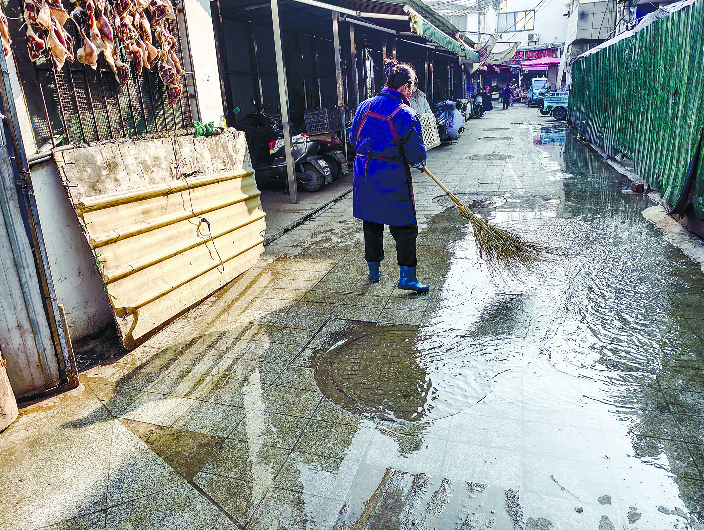 随后,记者跟随吴先生来到农贸市场内部看到,在菜场与沿街门面相邻的一条道路上,有一个窨井一直在往外冒污水,附近一位商户正拿着扫把在扫水。