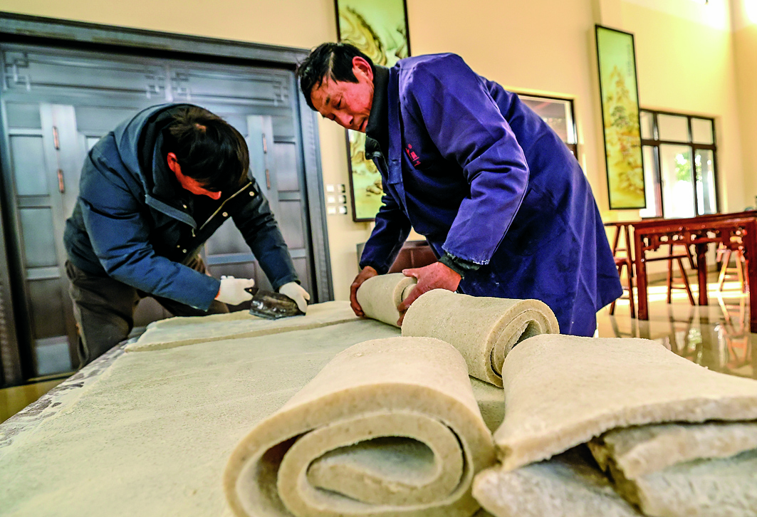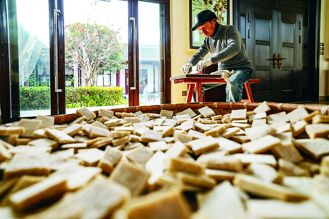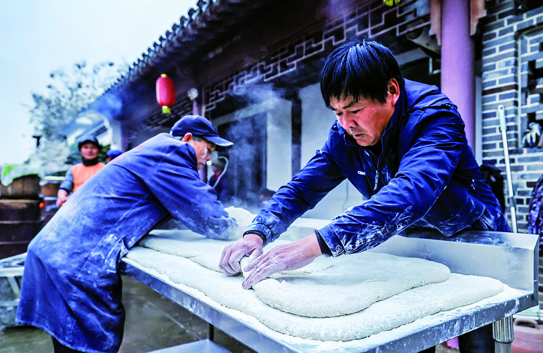 舂好的糍粑被麻利抬上案板,村民趁热反复揉压、摊平,让糍粑质地愈发紧实弹润后静置。次日,村民再将定型的糍粑胚进行分切、晾干,最后浸泡清水中保存,随取随吃。