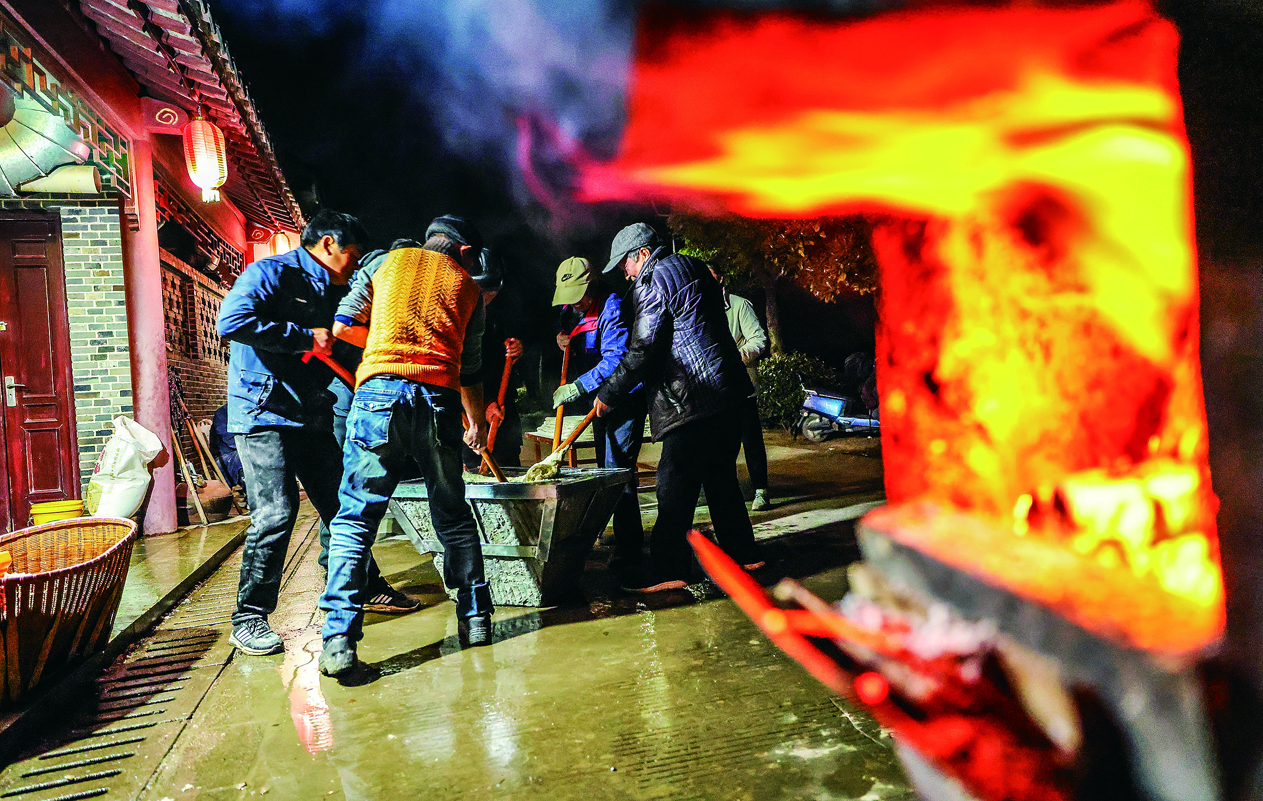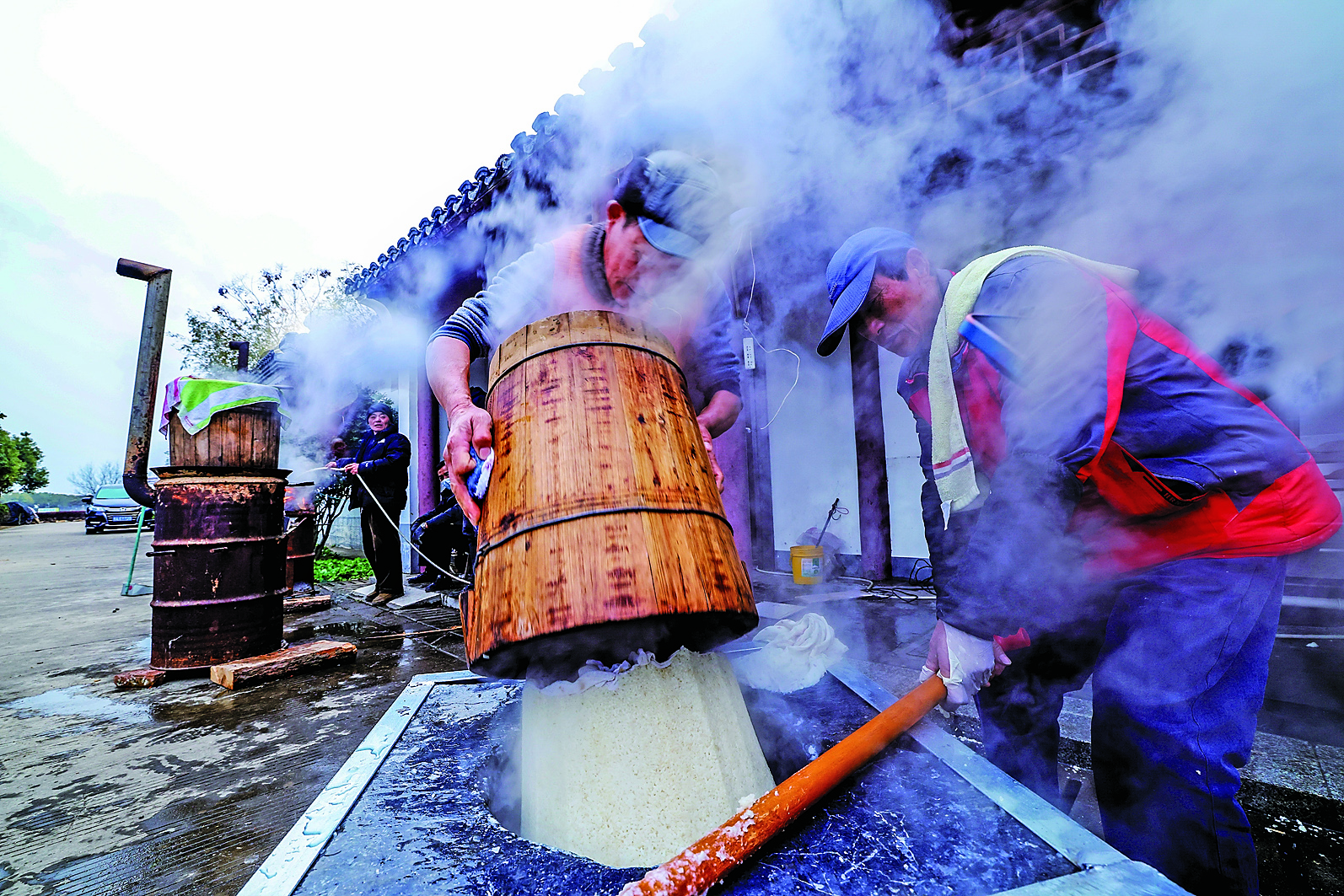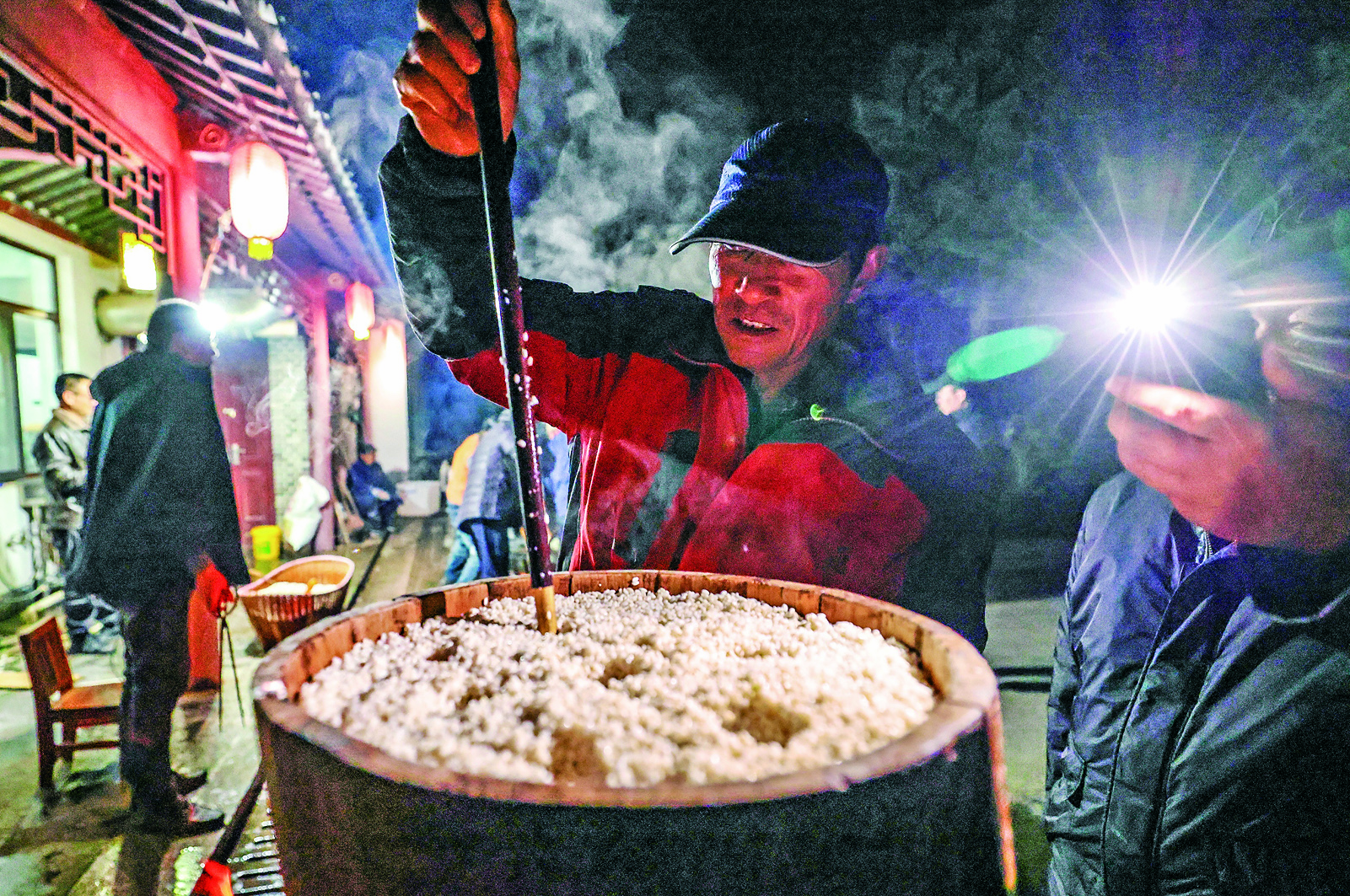 泡好的糯米粒粒饱满,被村民盛入木甑中,旺火蒸腾,白雾袅袅,清甜的米香裹着热气在院落里散开,这是八卦村人最熟悉的年节味道。待糯米蒸得软糯黏香,便迅速倒入厚重的青石臼中,六名村民各持一根木质糍粑棍,围着石臼合力舂打,众人边打边缓缓转动,口中齐声喊着浑厚的号子,木棍起落随号子节奏铿锵,每一下都是常年劳作练出的默契,舂打途中小心将糍粑翻身,确保通体捶打得细腻黏糯,这场忙碌从清晨一直持续到夜间。