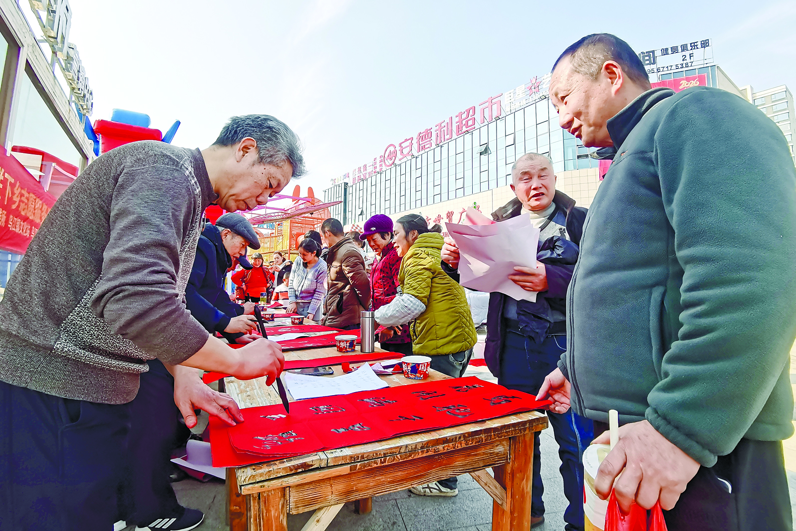 春联映红笑脸,“福”字暖人心田。在该镇汇金广场安德利超市门口,书法爱好者们同样铺纸研墨,专注书写。一副副寓意吉祥的春联在笔下呈现,每一笔都寄托着对新春的期盼。拿到春联的居民爱不释手,有的仔细欣赏,有的小心收好,脸上都洋溢着幸福的笑容。