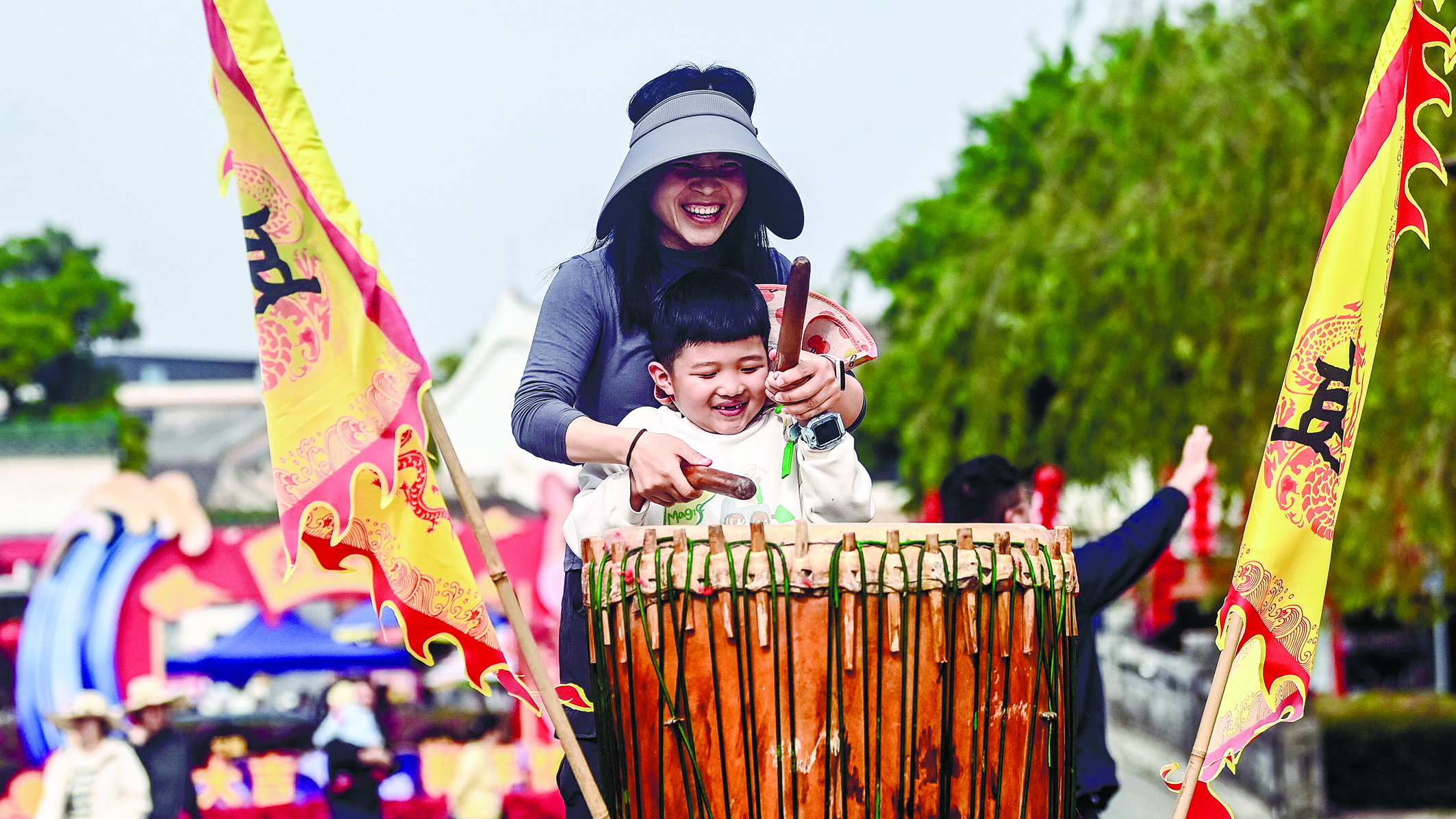 2月22日,在广西钦州市刘永福广场,市民在参与烟墩大鼓“击鼓迎春”活动。春节期间,在广西钦州市刘永福广场,轮番展演的新春采茶戏和烟墩大鼓“击鼓迎春”等活动,让传统文化的韵味飘香,丰富了群众的春节文化生活。 新华社记者 张爱林 摄