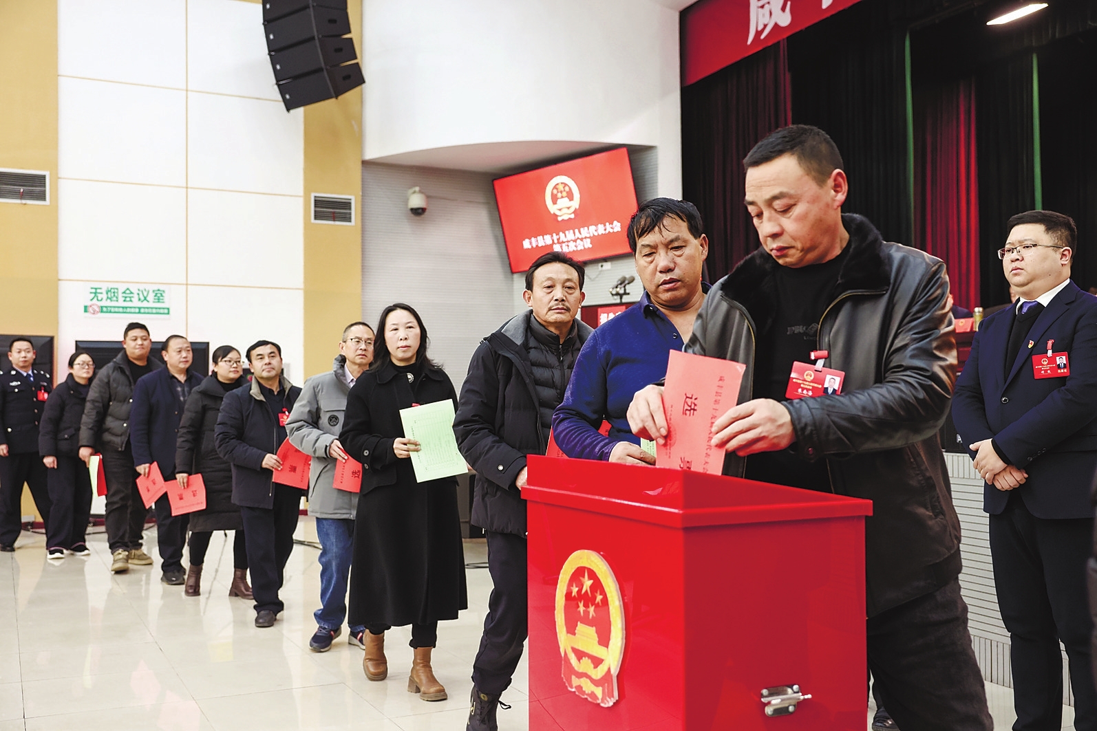 2021年11月5日,中南海怀仁堂,五星红旗鲜艳夺目,镶嵌着国徽的红色票箱端放正中。