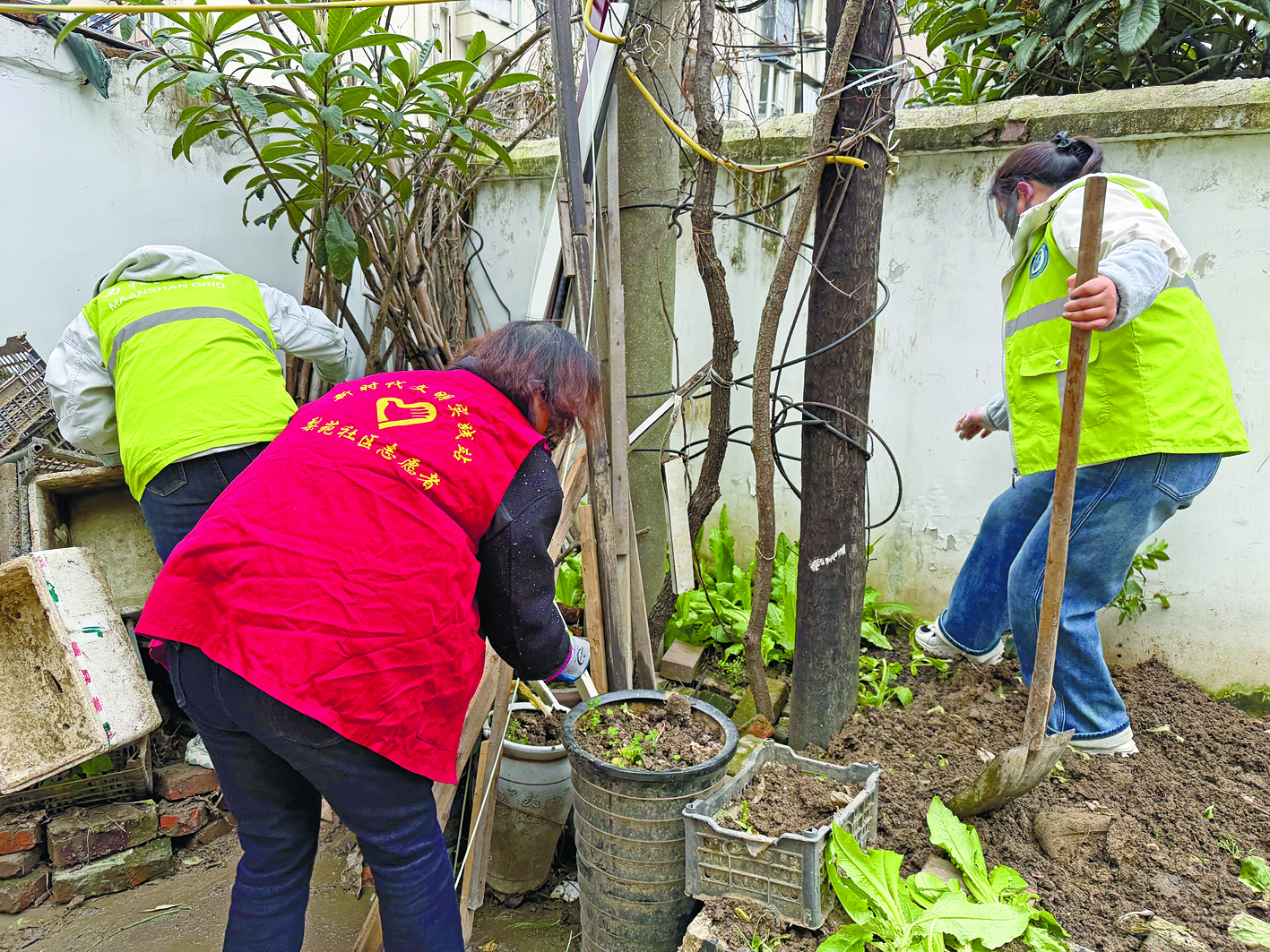 3月5日下午,集中清理整治行动在三个小区同时启动,社区工作人员、城管队员、物业人员分工协作,手持铁锹、镰刀、扫帚等工具,对逾期未清理的泡沫箱菜地、废弃种植容器、杂物肥料等开展地毯式清理。工作人员逐一拆除搬运种植工具,平整菜地土壤,清扫树池杂草垃圾,将清理物统一归集、分类清运,全力还原公共空间整洁原貌。