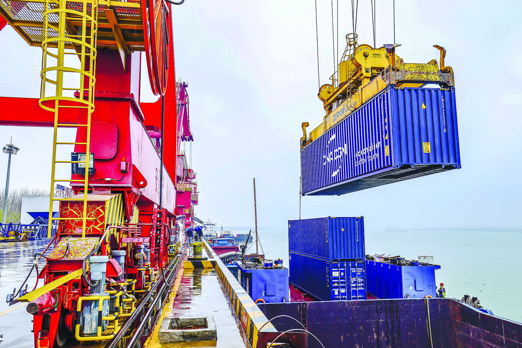 3月18日,在郑蒲港新区港口码头,港口龙门吊升降腾挪装卸货物,一派繁忙景象。近年来,郑蒲港新区充分发挥其在长江经济带的区位优势,整合长江航运、公铁水多式联运等中转和运输功能,着力打造安徽江海联运枢纽中心,“区港联动”“铁水联运”成效初显。