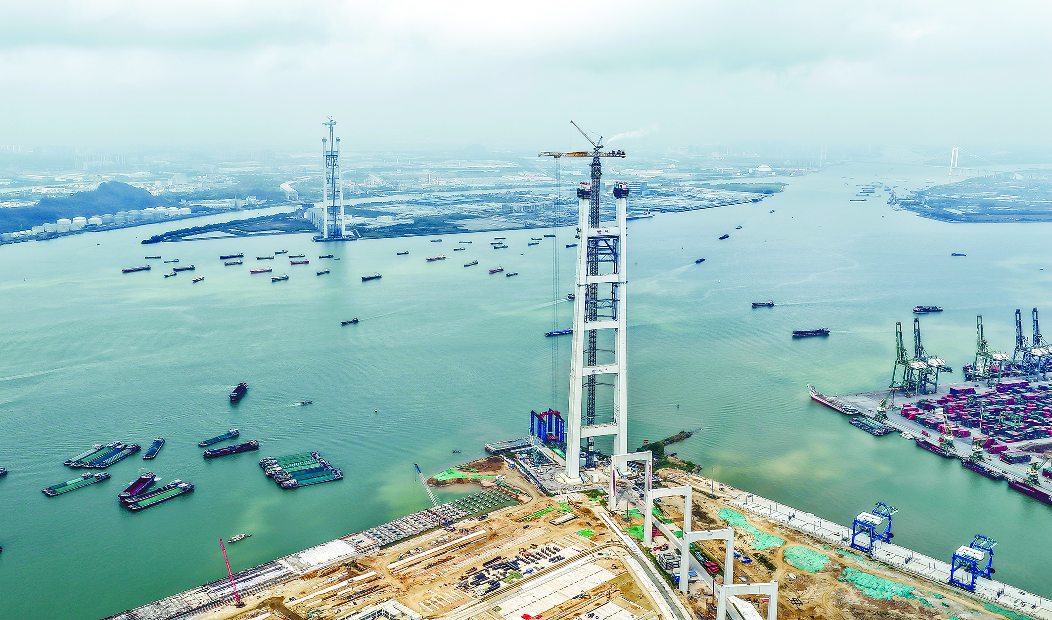 这是3月26日拍摄的狮子洋大桥东、西主塔(无人机照片)。