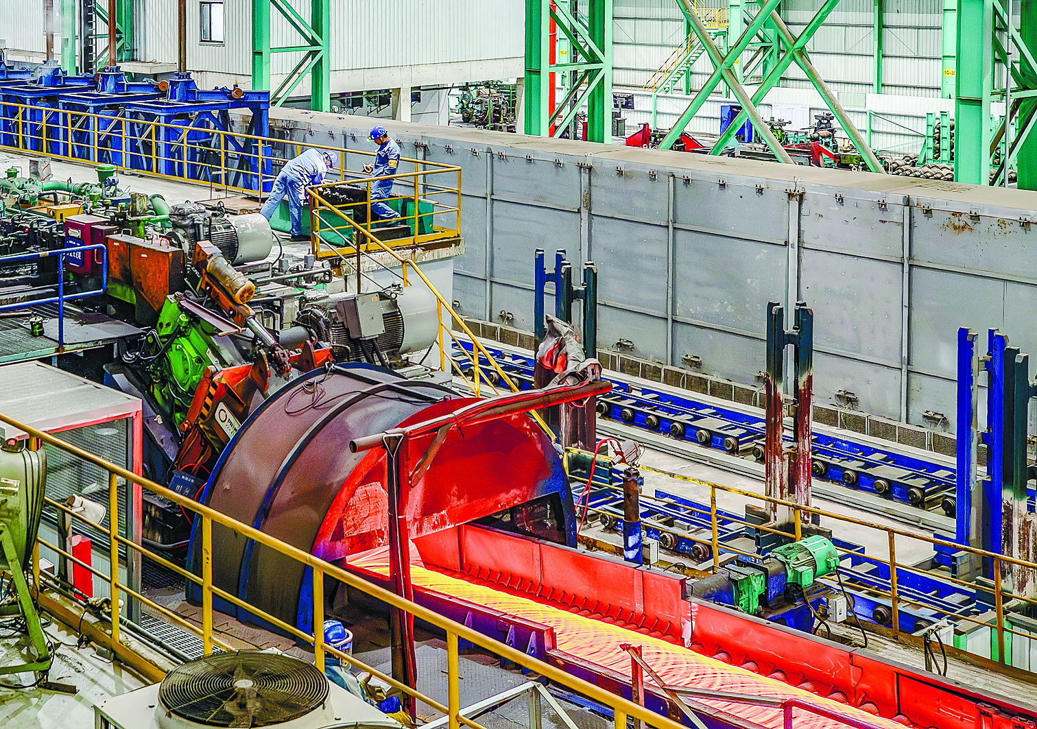 炼钢首席操作程元带领乙班职工放弃休假、坚守岗位,在平稳组织常规钢种冶炼的同时,高效穿插生产质量要求极高的风电能源用钢。转炉炼钢现场,职工们分工明确、紧密协作,密切监测炉内钢水温度和成分变化,精准把控吹炼节奏与冶炼全过程,紧盯每一个关键工艺节点。