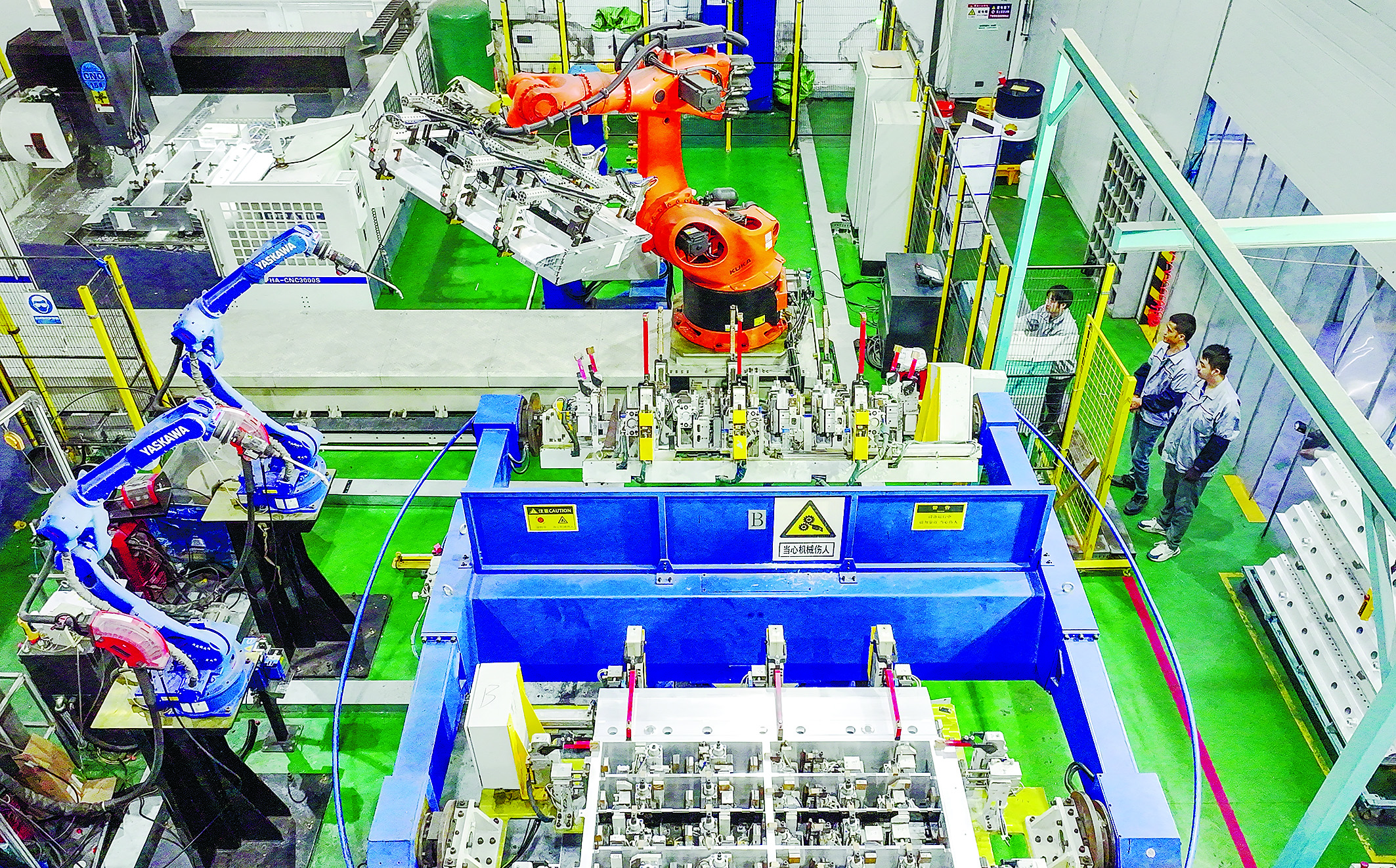 日前,位于当涂经开区的安徽和胜新能源汽车部件有限公司数字化车间,机器人在加工生产出口型电池托盘。