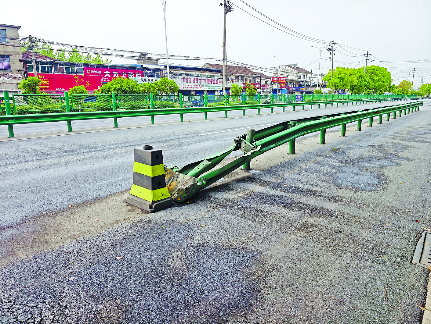 4月15日,记者来到市民反映的路段探访。在中国石化马鞍山分公司铜井加油站的出口,有一段用来分隔机动车与非机动车车流的防护栏损坏严重,其中有一节已经完全变形。该路段大货车较多,交通状况比较复杂。据加油站工作人员介绍,该护栏是在几个月前的一次道路事故中损坏的,不知道为何,后续一直没有人来维修。