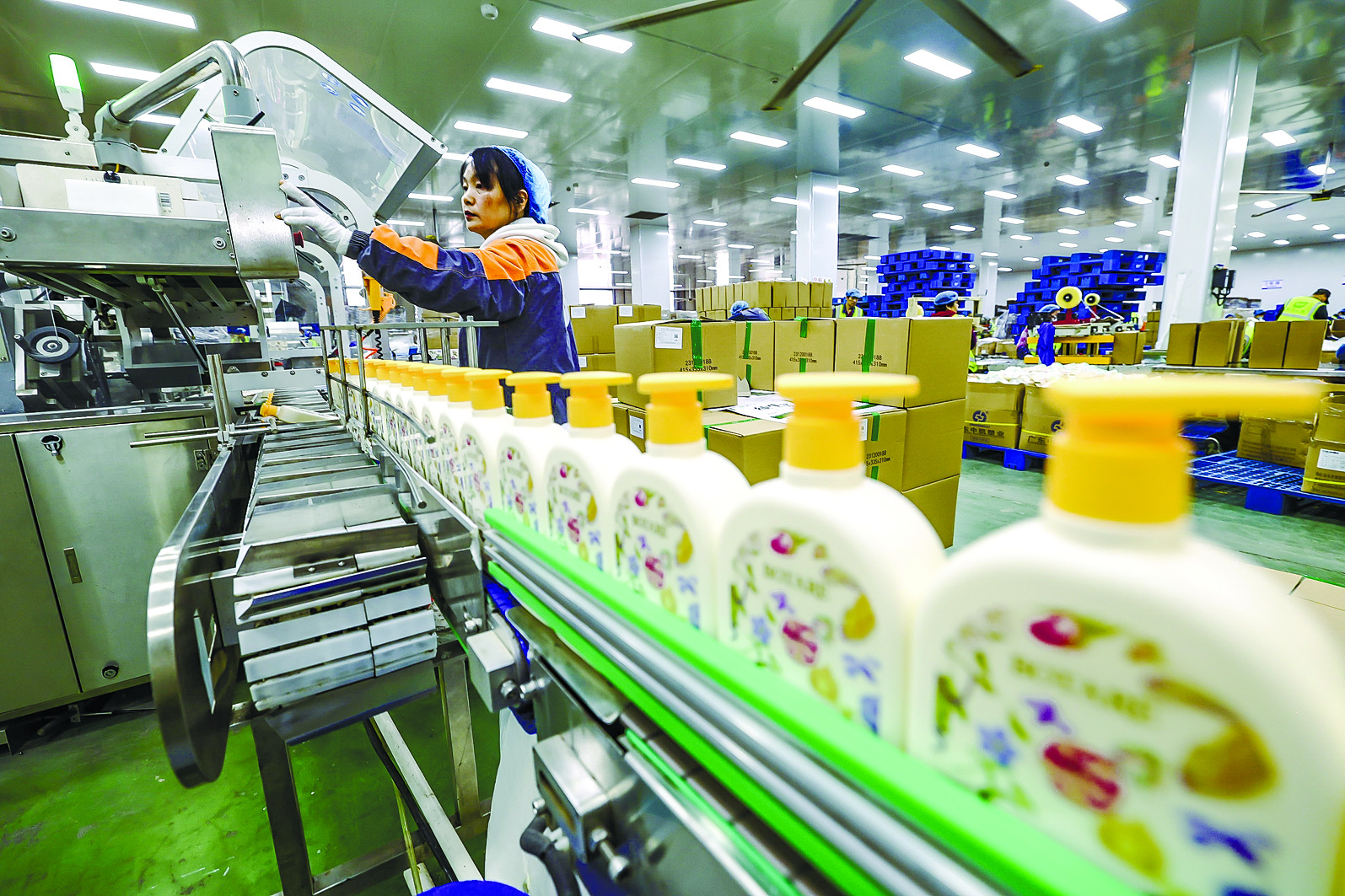 近日,当涂经济开发区植护家化有限公司生产车间内,自动化生产线高速高效、井然运转。一袋袋洗衣凝珠、洗衣液等日化产品源源不断下线,经过快速分拣、打包装箱后,陆续发往全国各地市场。