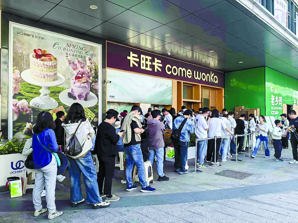 马鞍山印象汇购物中心卡旺卡门店外,人流从早到晚没断过,随处可见前来打卡的南京游客。柜台前挤满了举着手机准备拍照的年轻人,店员忙得脚不沾地:“周六单日订单破了一千,一单至少四杯。”