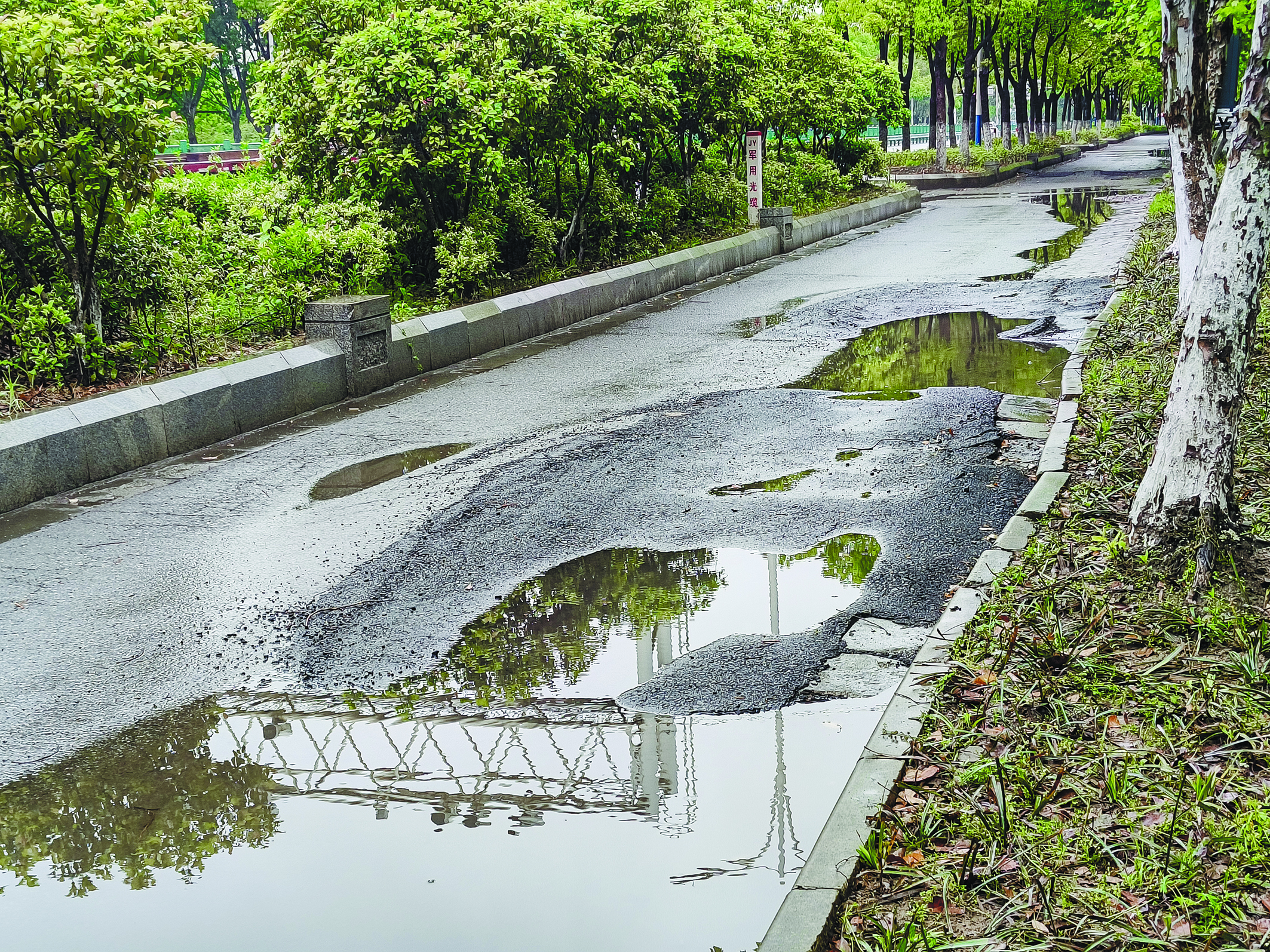 在应急修补点位东侧不远处,一段长约10米的非机动车道路面变形尤为明显,沥青局部凸起、局部凹陷,雨后形成连片积水坑洼。过往非机动车和行人经过时,不得不减速避让,不少市民坦言每次经过此处都是提心吊胆的。