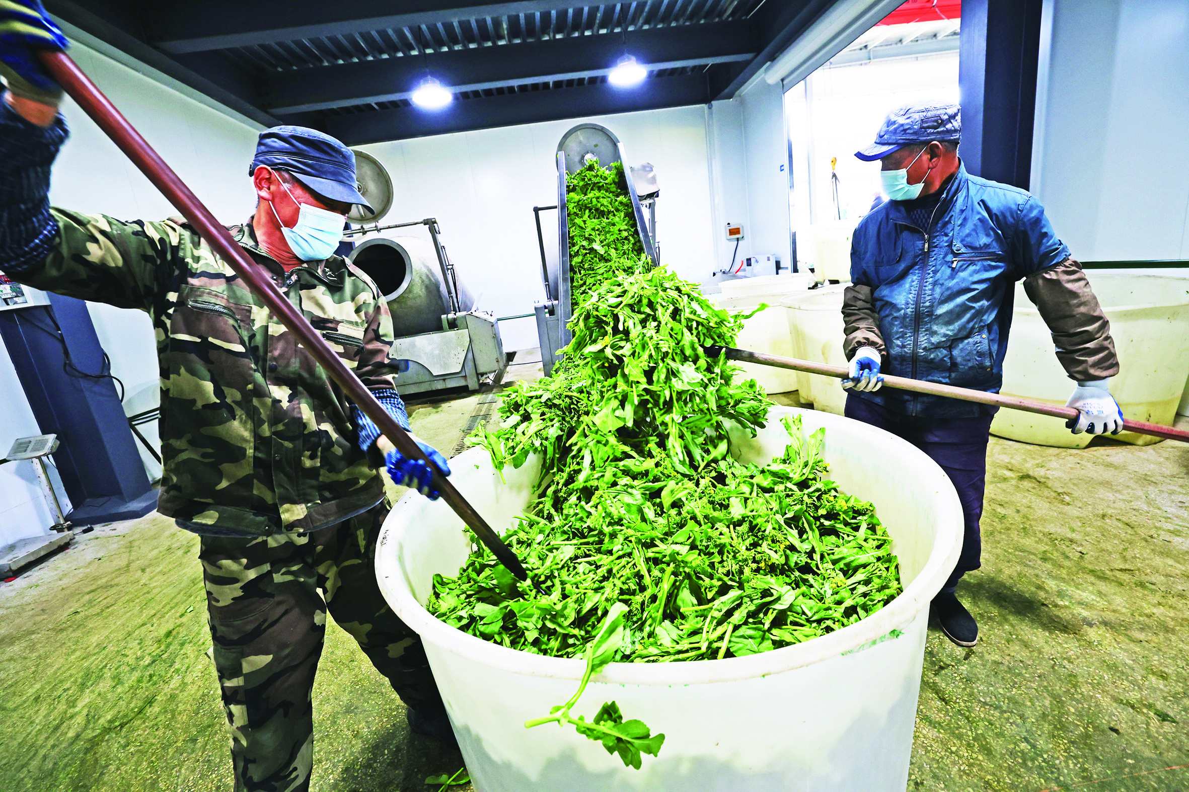 3月8日,在马鞍山快乐青年农业科技有限公司油菜薹加工基地内,工人们正忙着分拣、清洗、腌制新鲜油菜薹。 通讯员 王玉实 摄