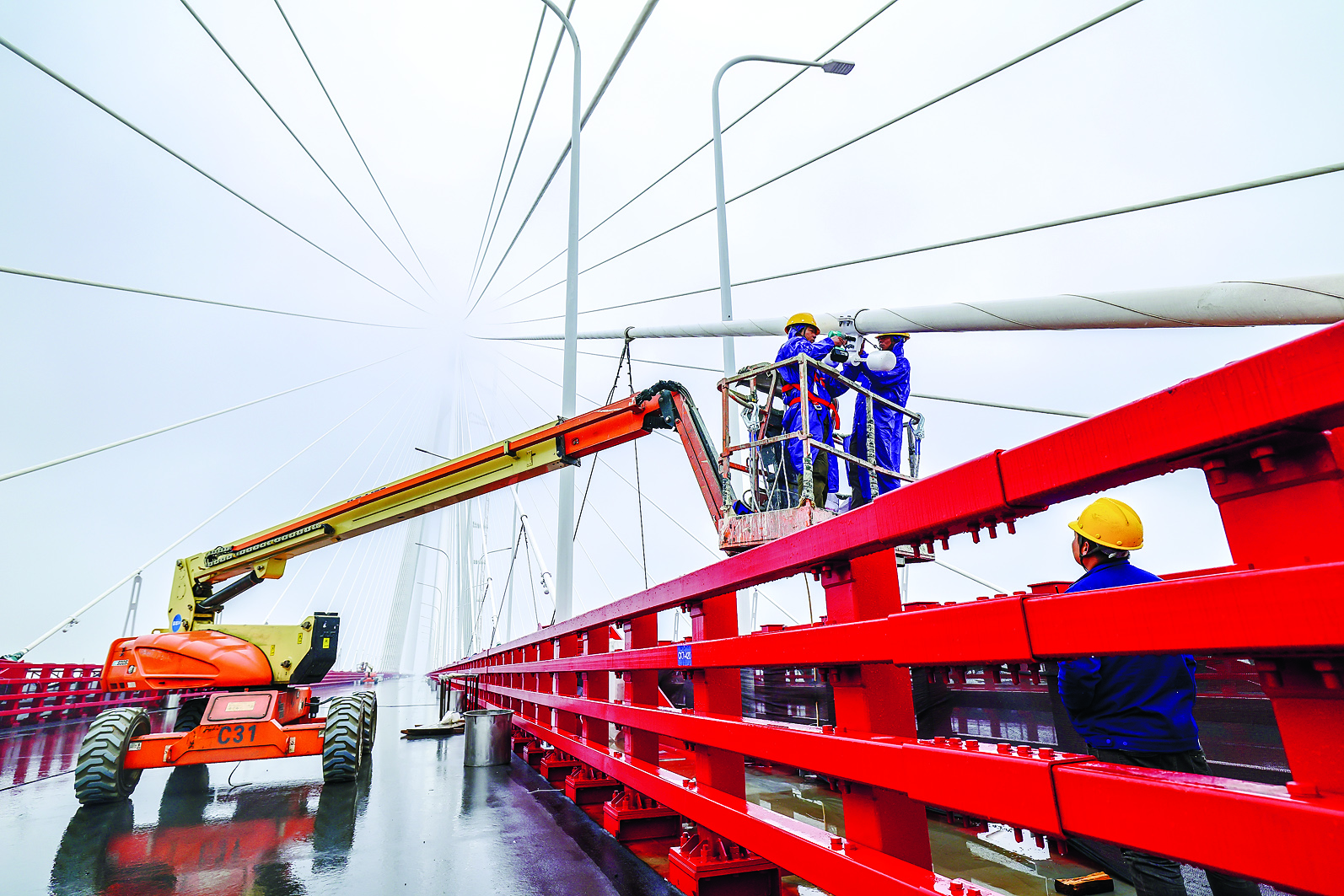 3月17日,巢马城际铁路马鞍山长江公铁大桥施工现场,中铁大桥局施工人员坚守岗位,冒雨为大桥安装斜拉索减震器,以精细化施工为大桥安全运营筑牢关键防线,向着巢马城际铁路全线建成通车全力冲刺。