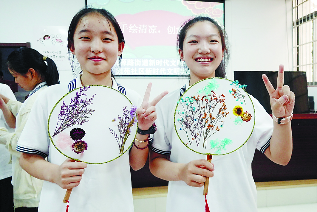 7月16日,花山区梨苑社区关工委联合市第七中学,组织学生开展压花团扇制作活动。