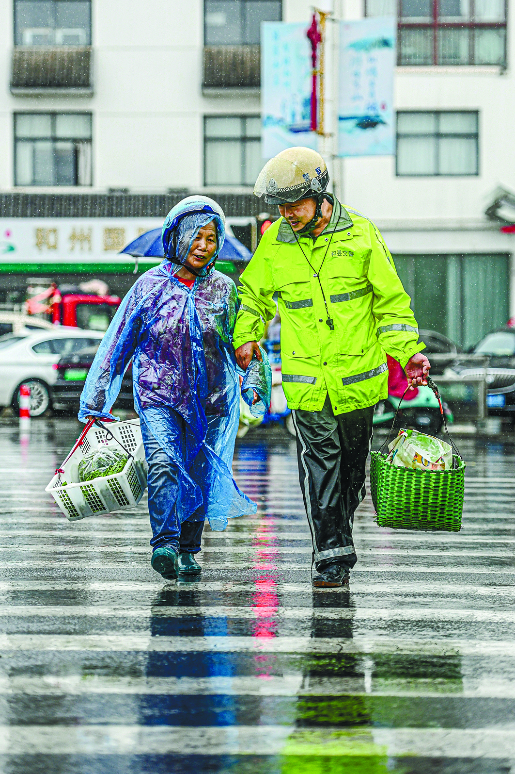 图为和县交警在雨中护送群众安全过马路。