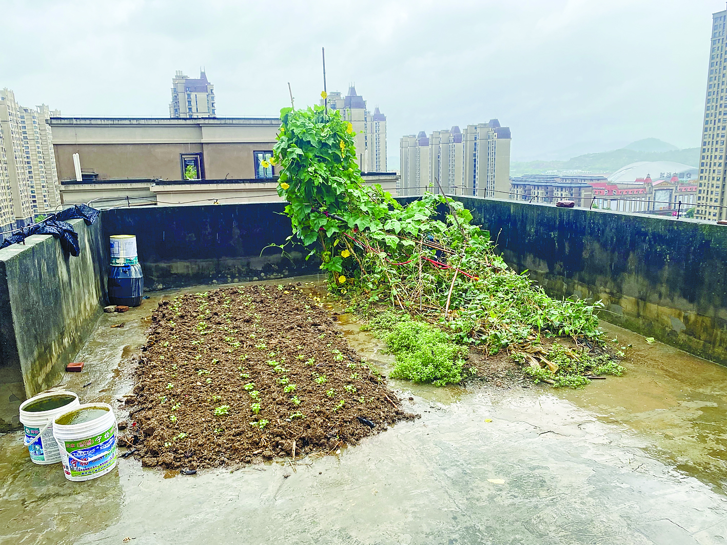 7月31日上午,记者实地探访培正花园小区。在2栋楼顶,记者看到多个水泥砌筑的花坛,里面种着辣椒、豇豆、韭菜、丝瓜等蔬菜;楼道内还堆放着花盆和肥料。