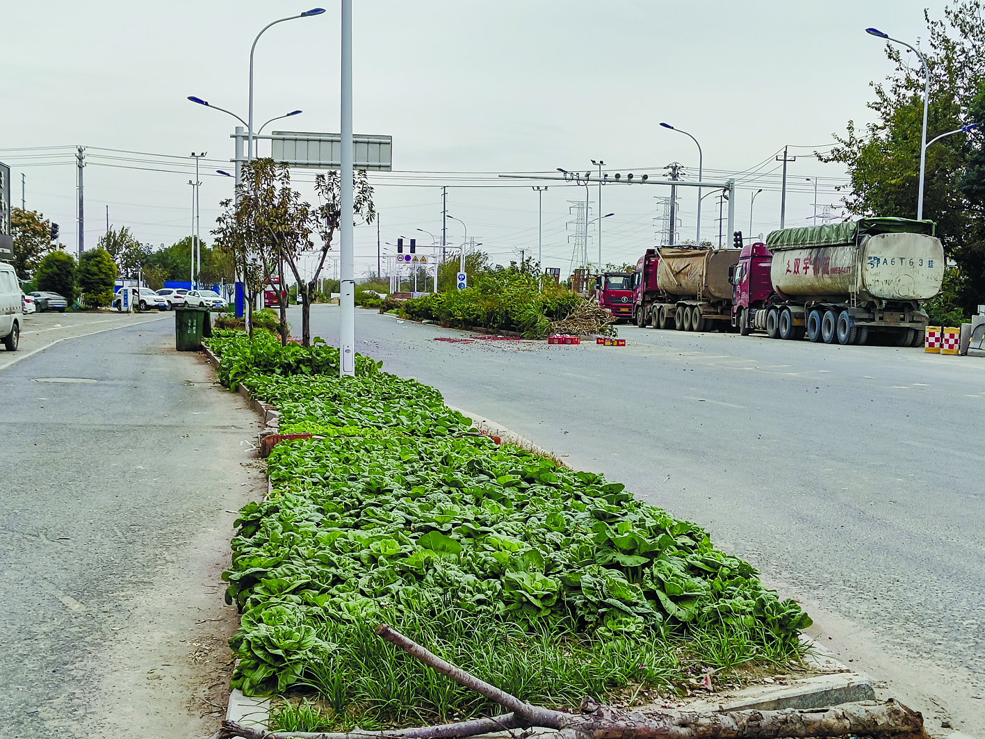 11月17日上午11时,记者赶赴现场核实情况。在南北走向的尼山路沿线,以及与之相交的纬三路、纬四路两侧,原先隔离绿化带内的绿植已被部分清理,取而代之的是一片片整齐的菜地,青菜、萝卜、大蒜、油菜等作物长势旺盛。部分菜地周边还用树枝搭起简易围栏,水桶、肥料袋等农具随意堆放在路边空地上,与道路整体干净整洁的环境形成了鲜明反差,显得极不协调。
