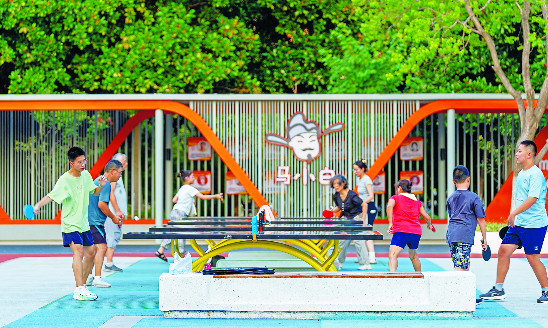 南湖体育公园改造后,设施覆盖全年龄段。环形步道上,中年人慢跑挥汗;儿童游乐区里,孩子们在沙坑和滑梯间追逐;乒乓球台前,年轻人激烈对决。